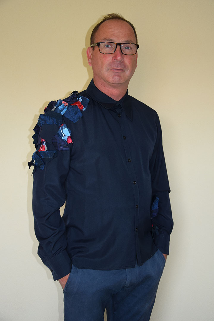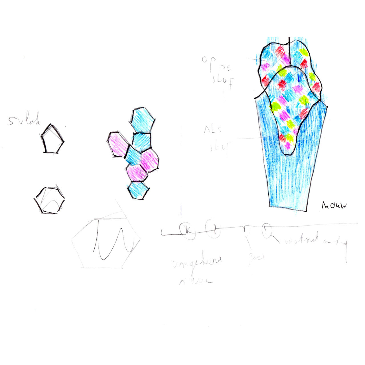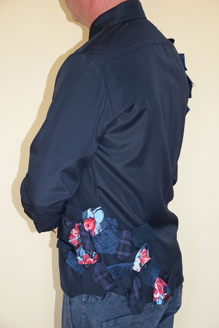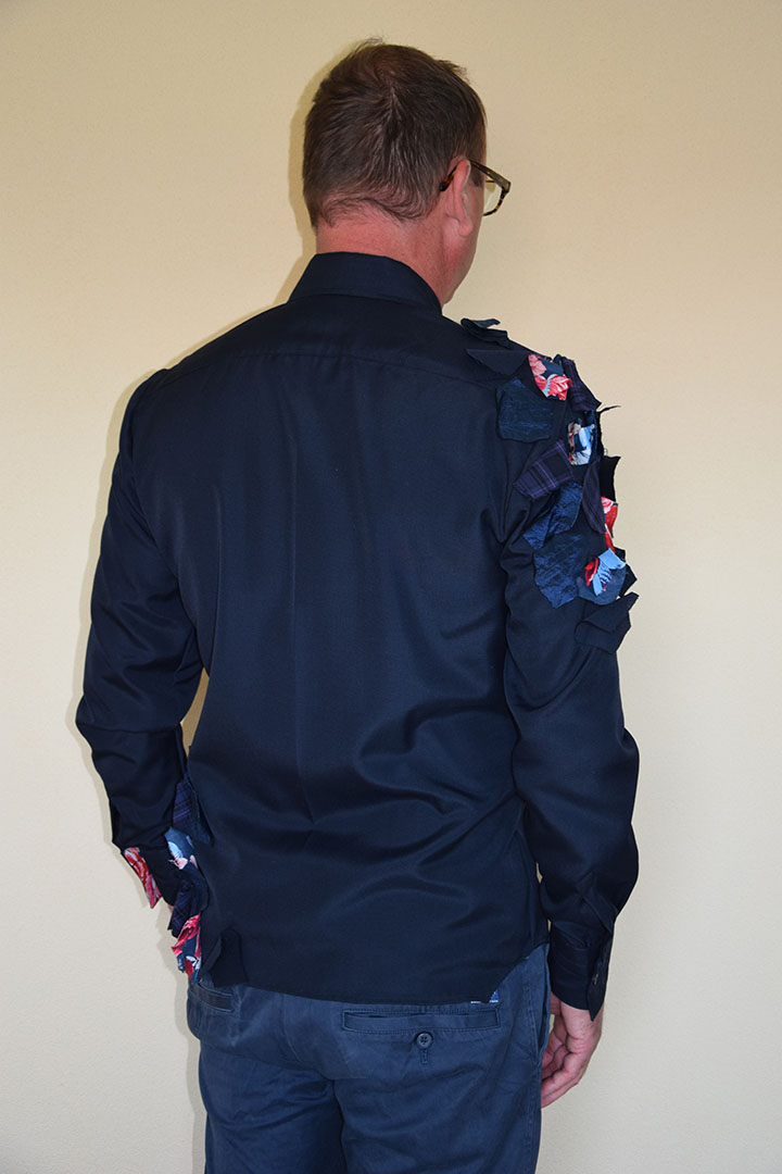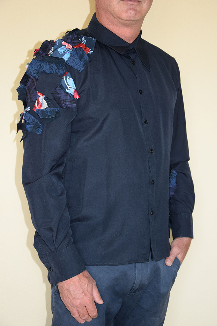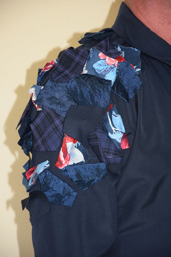 In deze blouse is een gelaagdheid van de stof aangebracht door losse vlakjes stof over de onderliggende stoflaag aan te brengen. De bovenste laag bestaat uit verschillende vijfkantige stukjes stof, die in een bepaald patroon over de blauwe onderste stoflaag zijn gelegd. Hoe groter de bovenste “stoflaag” des te meer de kleur van het blauw afwijkt. De bovenste laag loopt over de verschillende patroondelen heen. Van mauw naar schouder.Van achter naar voorpand. De vorm is organisch; alsof de stukjes stof als bladeren naar de hoek gewaaid zijn.