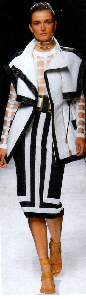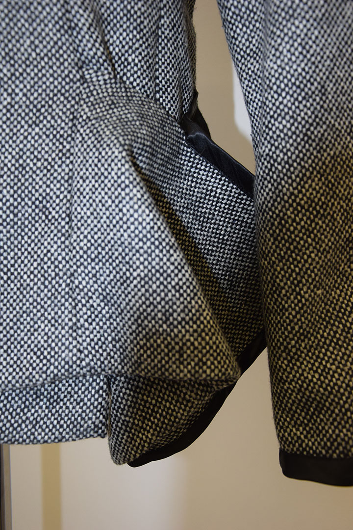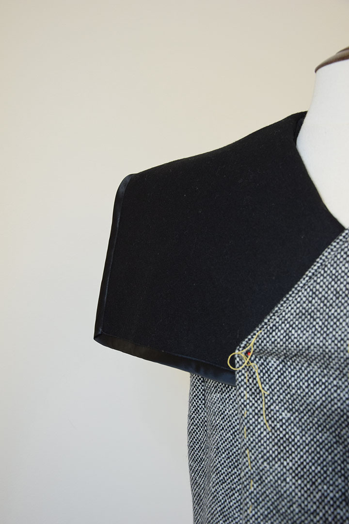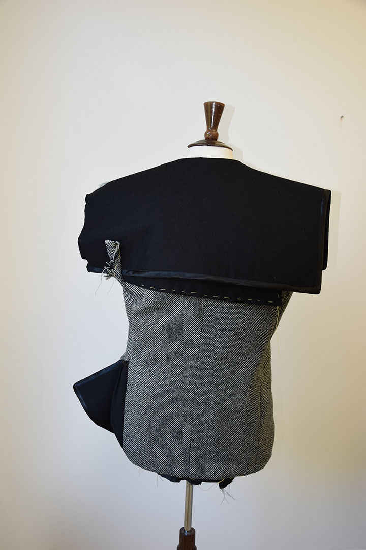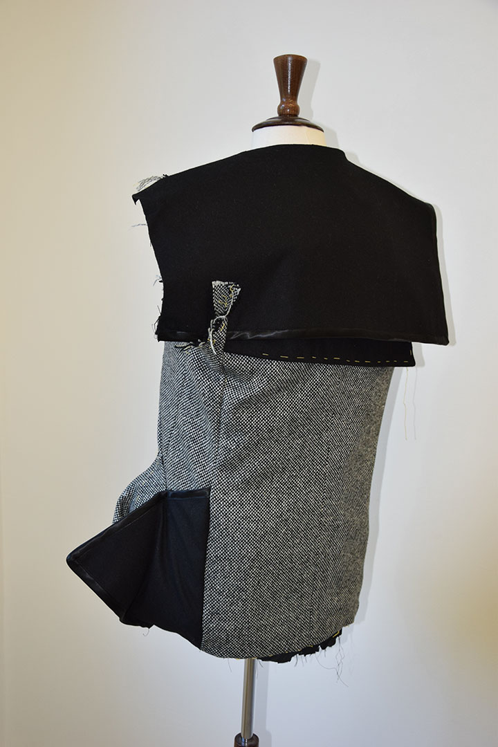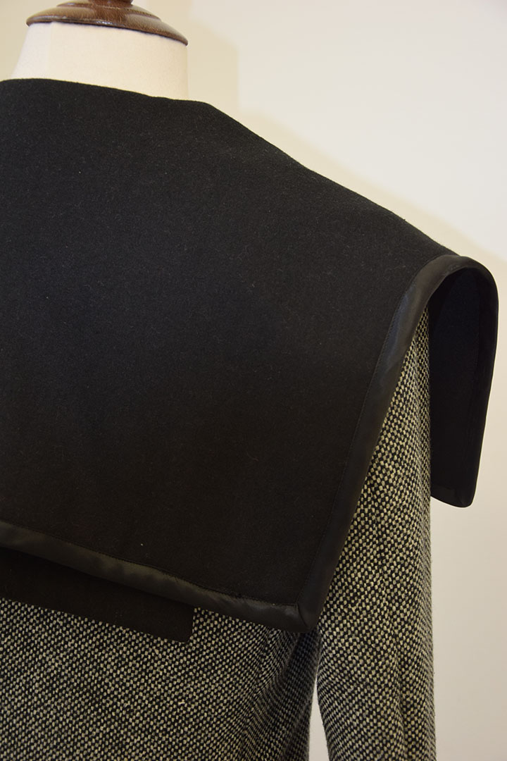 In deze jas zijn verschillende stoflagen gebruikt en zijn stofdelen op verschillende manieren gevouwen. De zwarte kap is deels over het voor en achterpand gelegd. Doordat hij over de schouder uitkraagt geeft dat een mannelijk effect. De zwaarte van dit gebaar wordt gecompenseerd door de complexiteit van de gevouwen stof aan de andere onderzijde. De stof buigt naar voren en vouwt naar achteren om aan te sluiten bij de dubbele voorpand. De uitstekende vorm wordt benadrukt door het zwarte satijnband die ook de zwarte achterkant aankondigt.