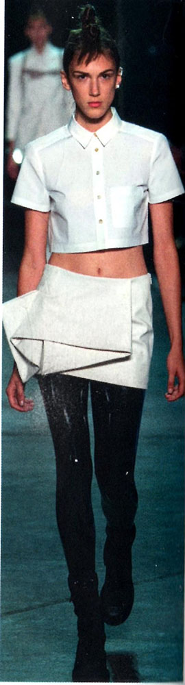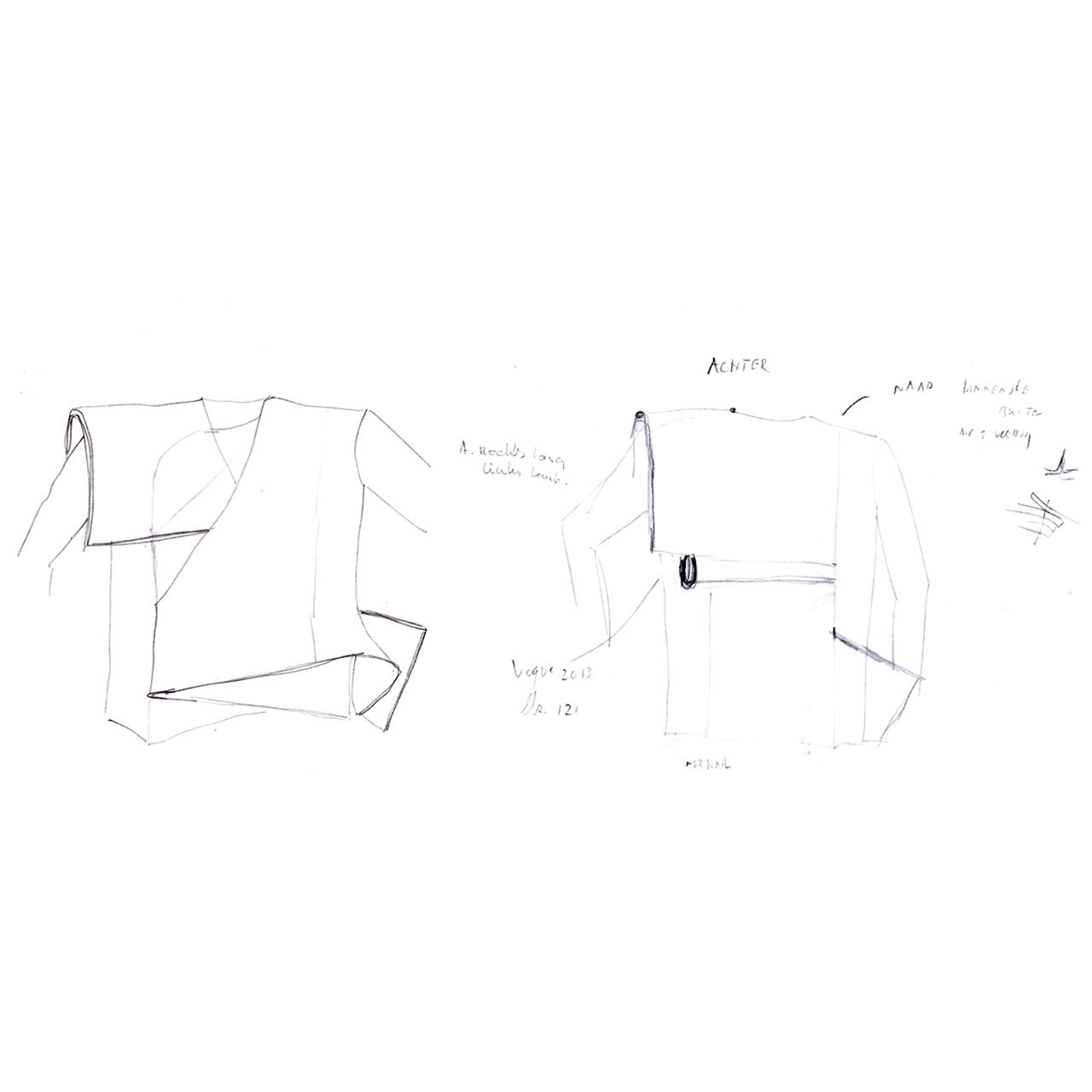 Het ontwerp van Marc Jacobs intrigeerde mij door zijn complexiteit. Wat gebeurt er in deze rok/overslag? Hoe is deze stof gevouwen? Ik heb dit idee verwerkt aan de onderkant van een jas. De kap moet tegenwicht bieden aan de complexiteit van de gevouwen stof.