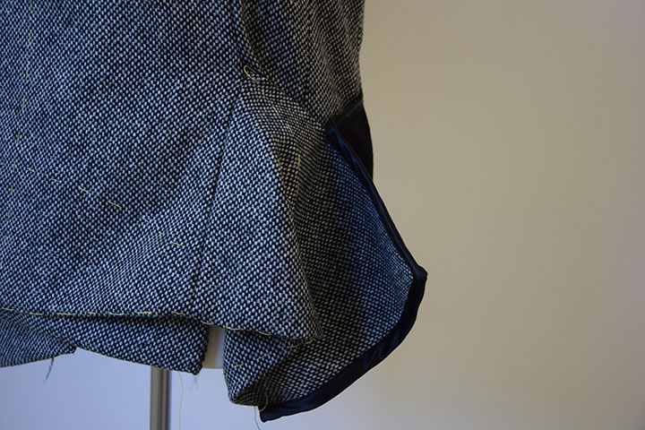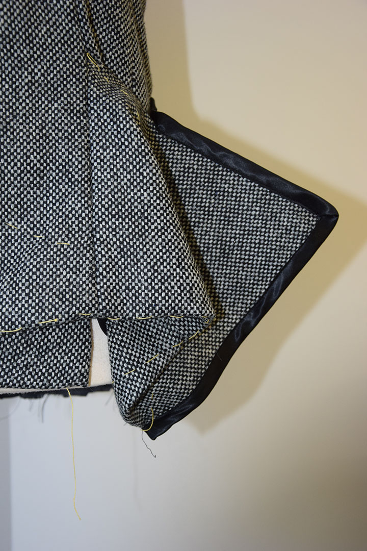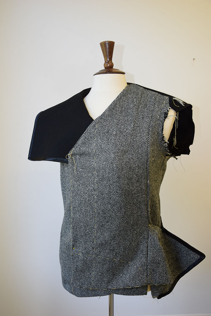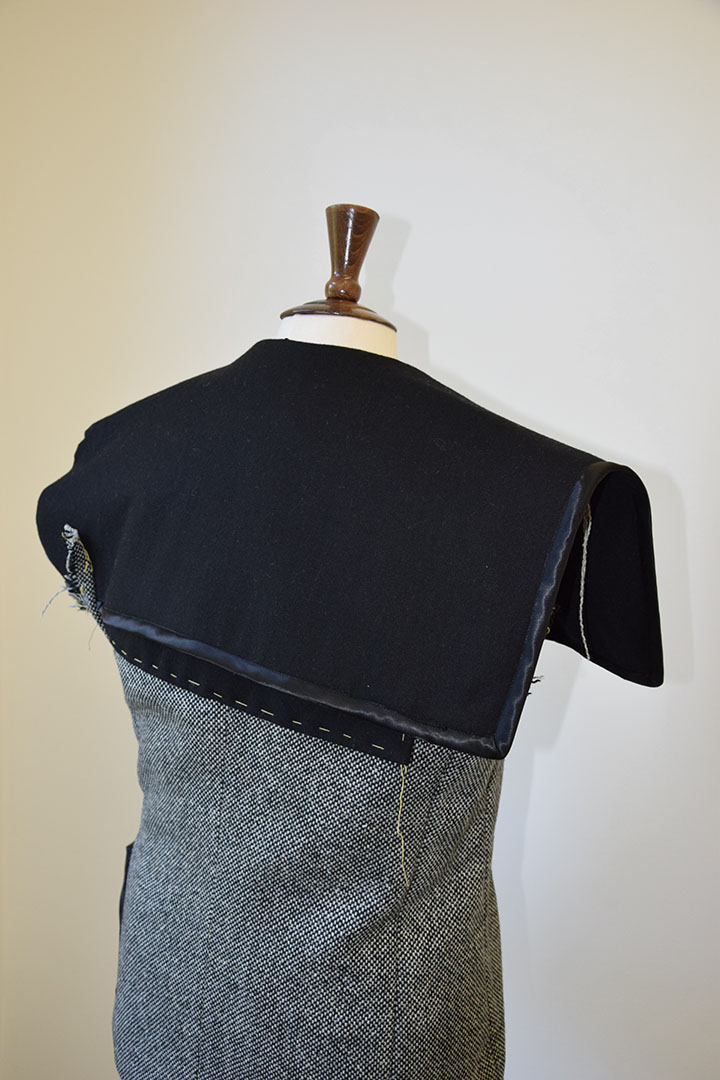 Aan het voorpand is een stofdeel toegevoegd dat vervolgens op een bepaalde manier is opgevouwen zodat nog maar een deel uitsteekt. Het voorpand verloopt schuin en is dubbelgeslagen. De achterste stoflaag nadert de lengte van het gevouwen stofdeel, zodat het meer een eenheid vormt. Om de kap in model te houden is deze zwaar verstevigd met vlieseline. Aan de achterzijde is nog een stoflaag aangebracht om het lijnenspel speelser te maken en minder strak. Hierdoor ontstaan hier vijf stoflagen. De kap loopt in de naad van het achterpand en mouw weg. Aan de andere zijde van het achterpand wordt het uitstekende deel van de gevouwen stof aan de voorzijde opgevangen door een zwarte stoflaag die schuin wegloopt in de achternaad van het achterpand.