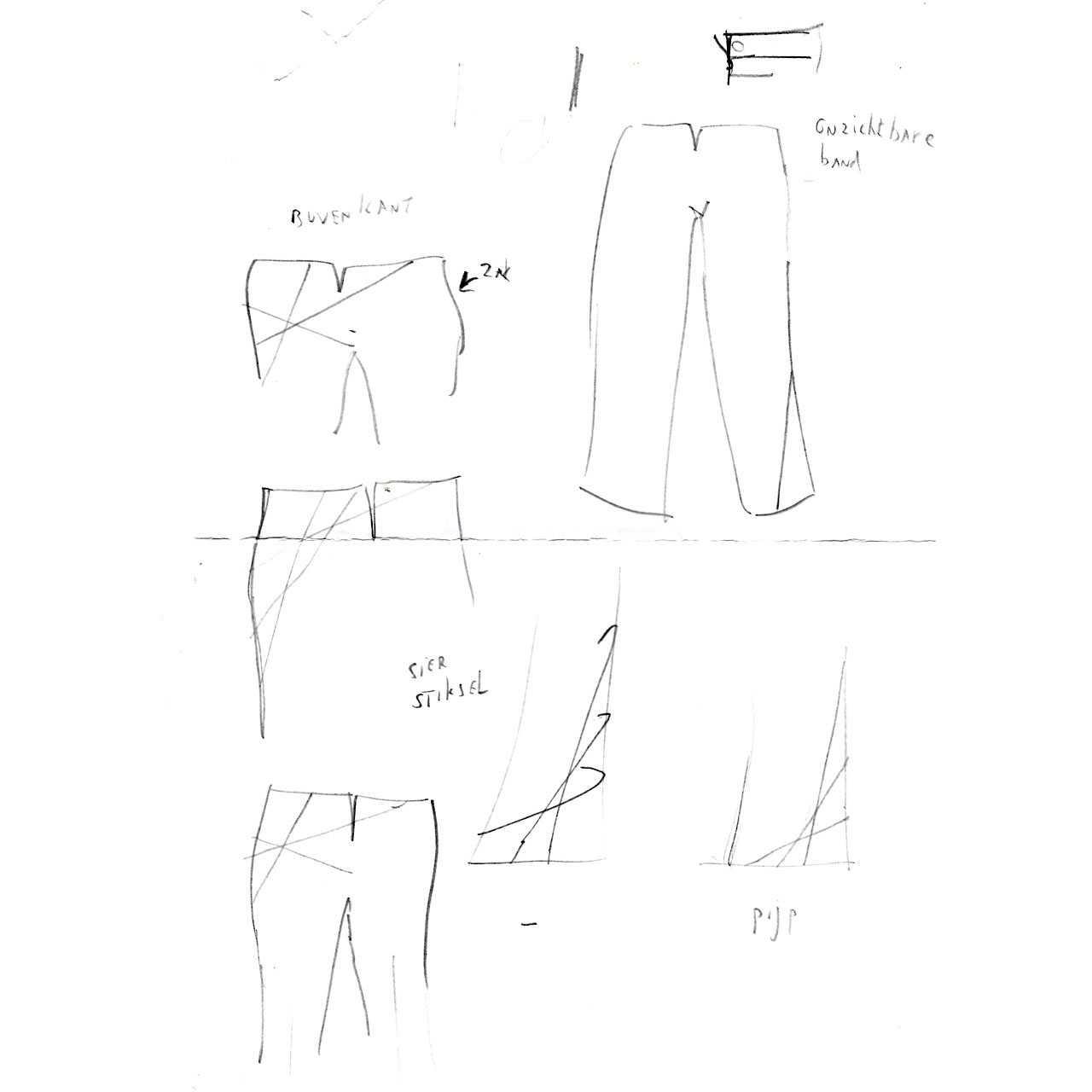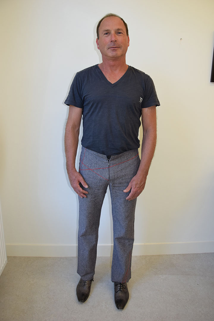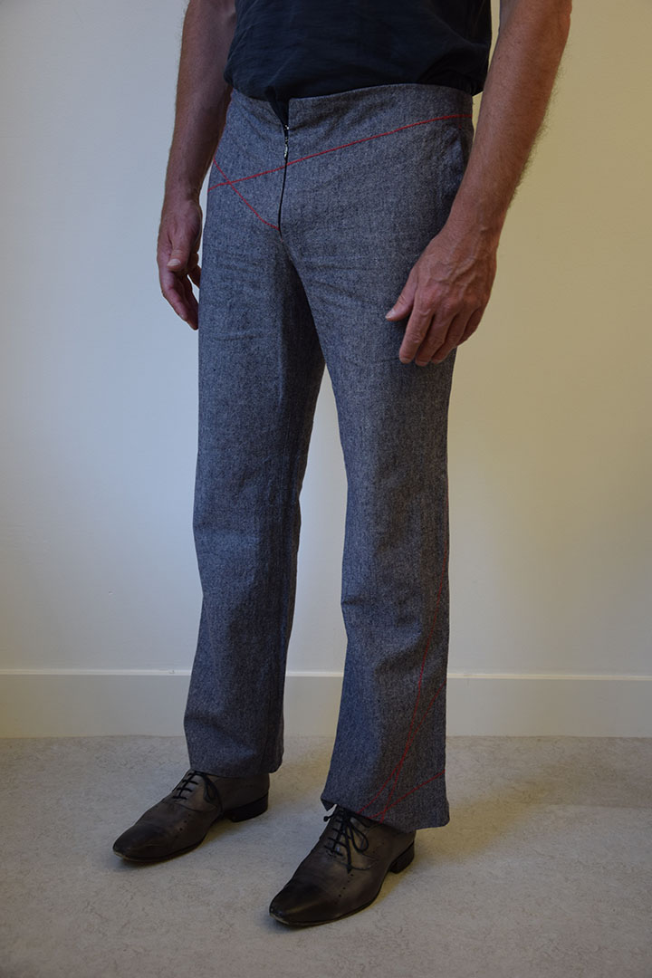 Ik was geïntrigeerd door de wijze van sluiting van deze broek, die wegbleef van een norrmale gulp en band. Dat geeft de broek een verticaler en platter beeld.