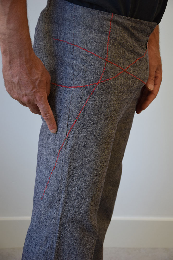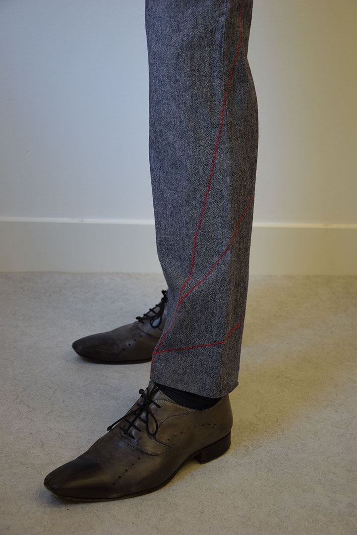 De broek is in een andere volgorde in elkaar gezet dan gebruikelijk om te zorgen dat de rode stiksels rechtdoor lopen over de panden heen. Zo is voor de pijp eerst de buitenzijde genaaid, waarna de rode stiksels zijn aangebracht. Daarna is de binnenzijde, de binnennaad, genaaid.