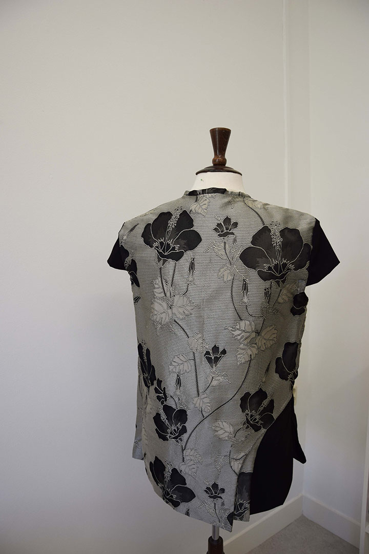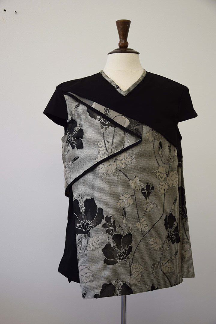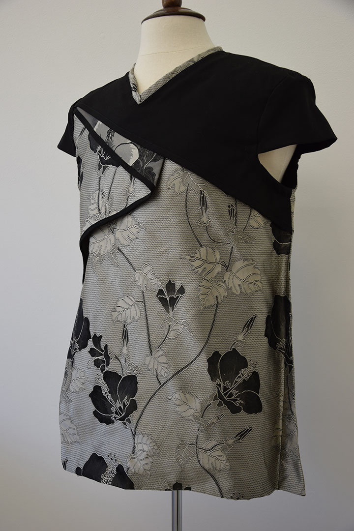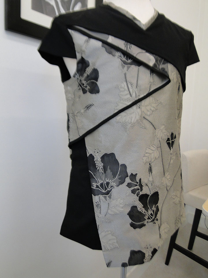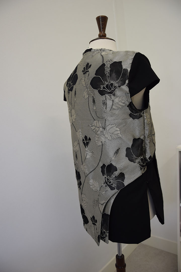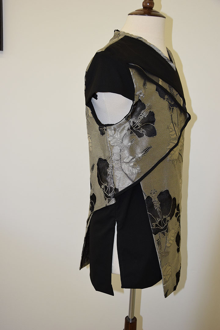 Deze jas heeft een combinatie van stoerheid en zachtheid in zich. Waarbij de gekozen materialen het een oosterse uitstraling geven. De jas is opgebouwd uit scheefgeplaatste stofdelen, die elkaars deels overlappen. Zo ontstaat een interessant lijnenspel tussen onderlaag en bovenlaag. Door de kapmouwtjes wordt de bovenkant verbreed. De blote armen geven de jas een mannelijke twist.