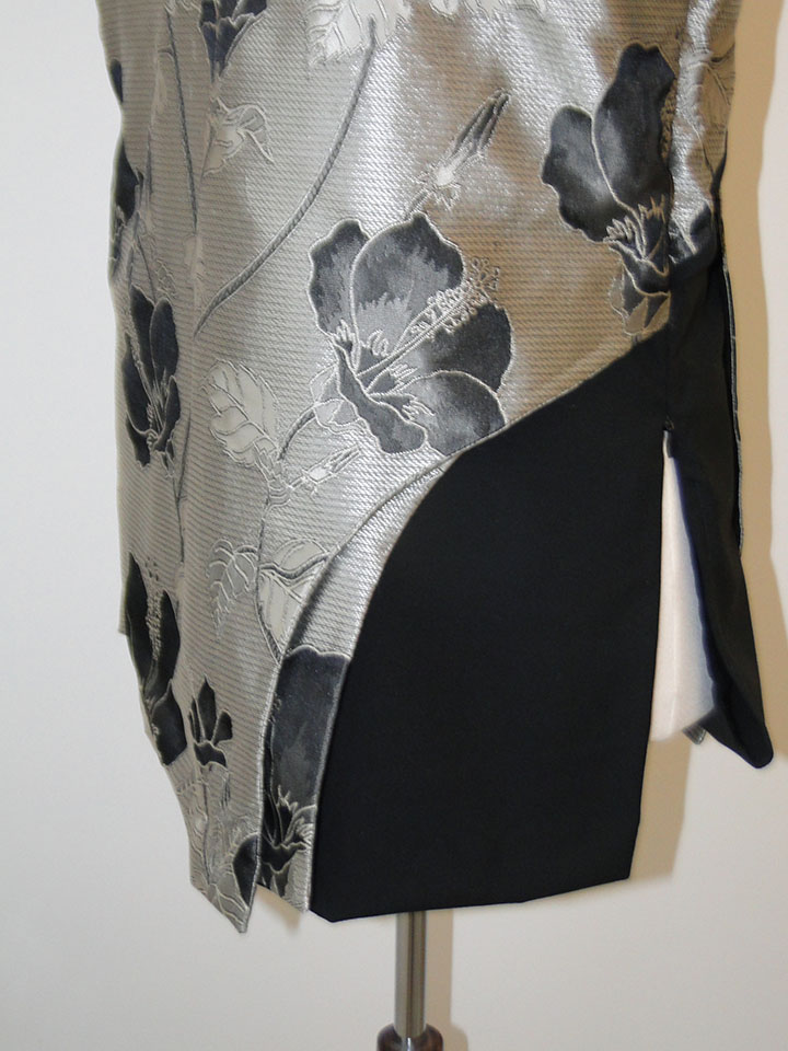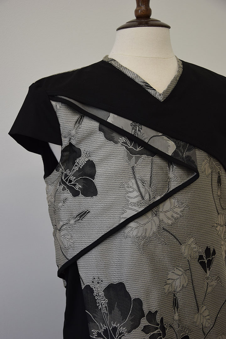 Er liggen diverse lagen stof in het voorpand. In totaal 5 lagen. De onderste zwarte laag is dubbelgeslagen, zodat hier een ronde overgang ontstaat die schijnbaar loshangt. Aan de linkerzijde is de tafzijde omgekeerd aangebracht en omgeslagen, zodat de goede zijde zichtbaar wordt.Deze laag vormt een overgang nar de zwarte onderstof. Daaroverheen ligt een zwarte kap. Het lijnenspel wordt benadrukt door het aanbrengen van bandjes in zwarte stof.