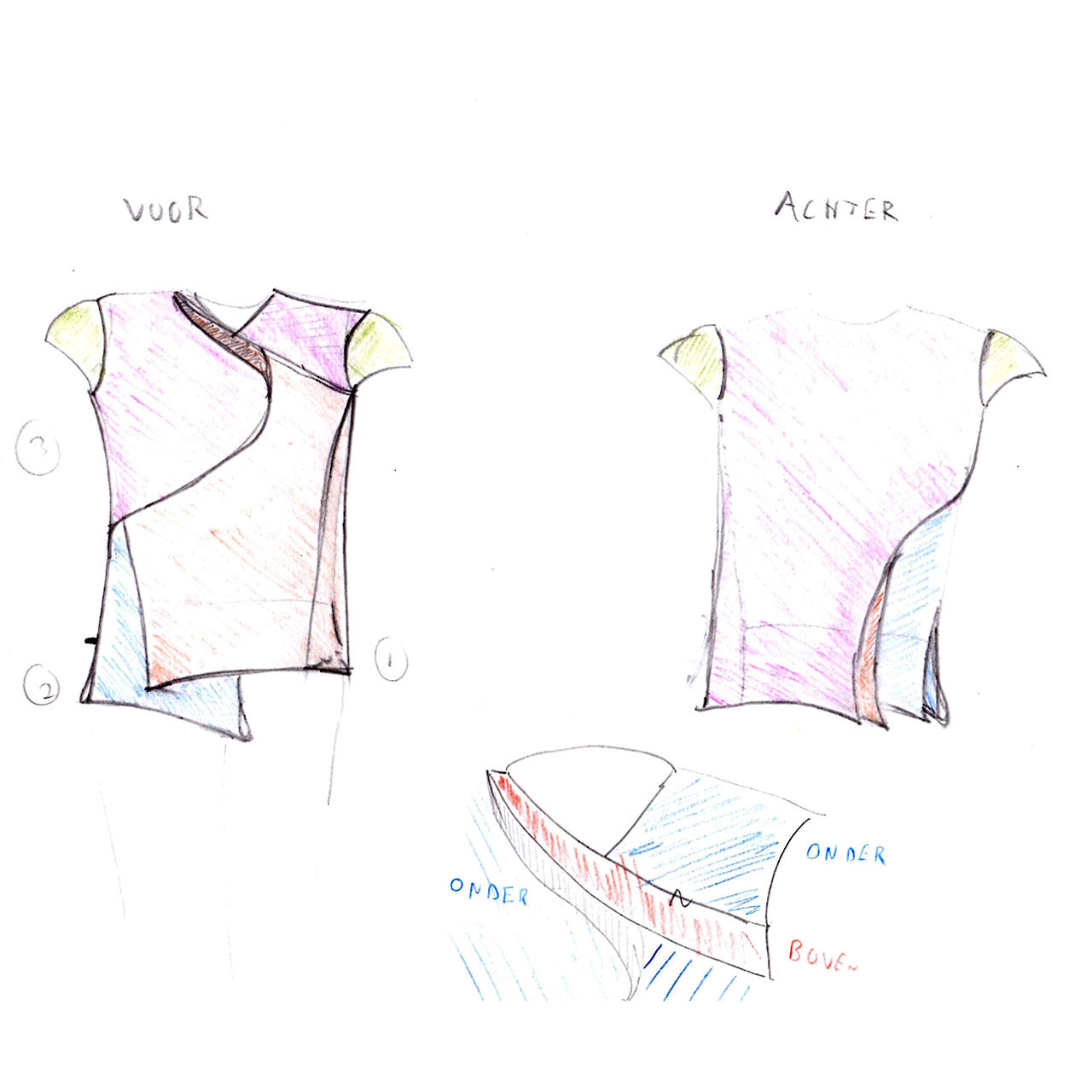 In het ontwerp wilde ik vooral gelaagdheid aanbrengen. Steeds komt er weer een nieuwe stoflaag tevoorschijn.. Met de lagen stof is gespeeld door ze soms om te keren. Of door losse flaps te maken die het silhouet veranderen. Het ontwerp moet van de voorzijde naar de achterzijde doorlopen waardoor de zijnaad geen breuklijn wordt.